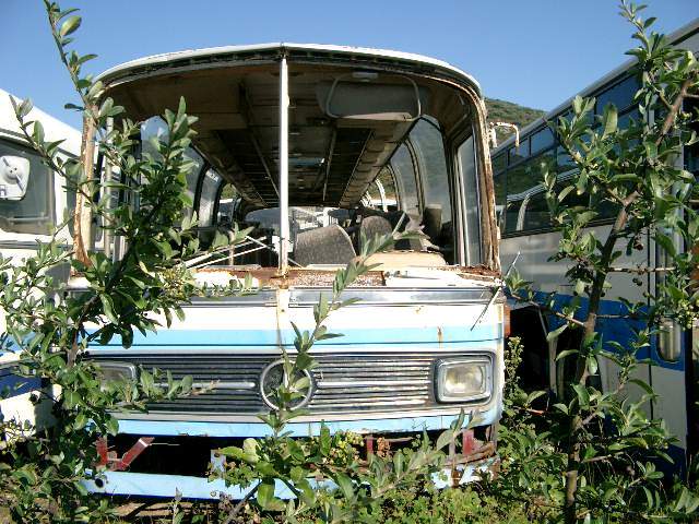 | Das Markenzeichen des Busverwerters in Frankreich | Unser Busle vor dem Busverwerter, der leider auf der Fahrt nach Spanien geschlossen hatte, aber im Rauf haben wir in angetroffen | "Meine zukünftige Frontmaske " die haben wir auf der Heimfahrt gegen 150 € erworben und im strömenden Regen demontiert. Leider war sie bereits in der Mitte geschweißt und auch stark angerostet. | |||